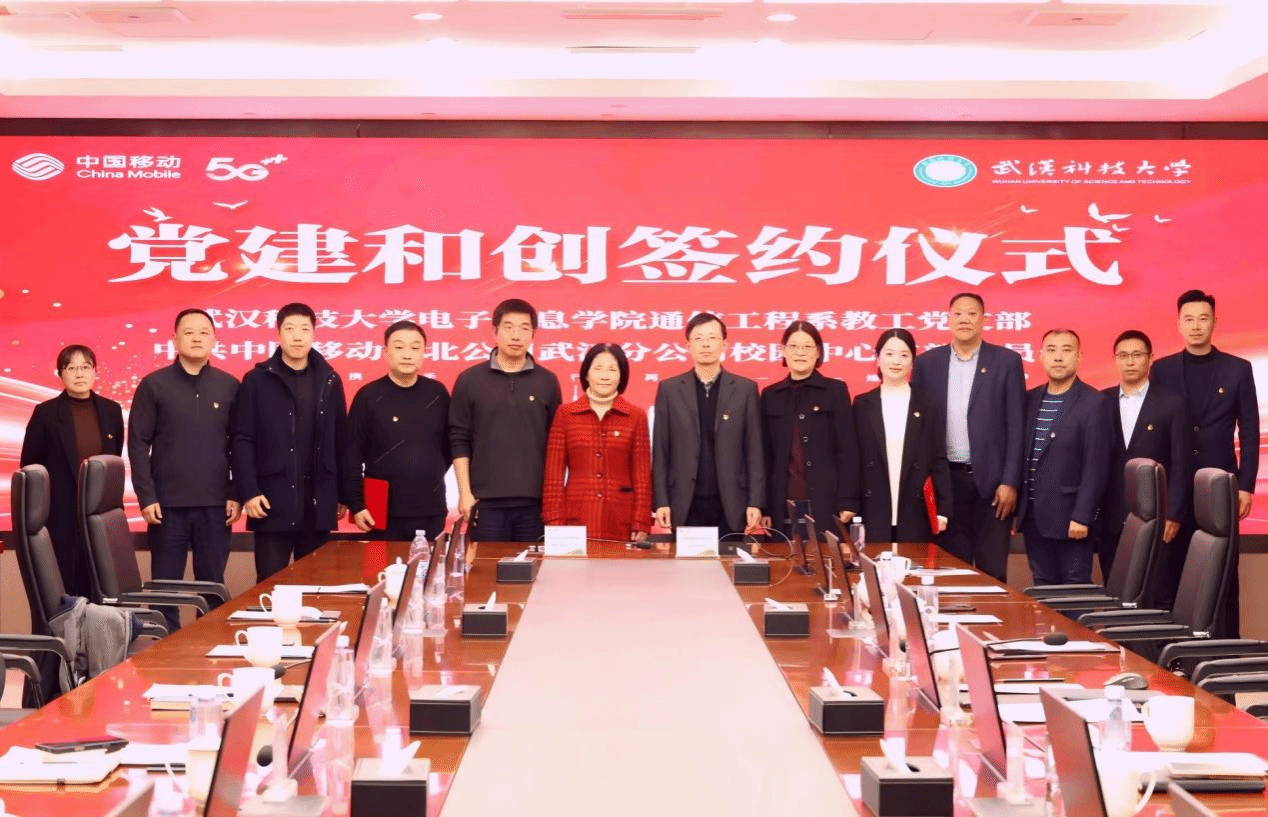 本网讯(通讯员 胡照鑫)为深入贯彻落实党的二十大精神,进一步深化产教融合,探索“党建+业务”双融双促新模式,1月16日下午,电子信息学院通信工程系教工党支部一行前往中国移动武汉分公司,与中国移动湖北公司武汉分公司校园中心党支部共同举行了“党建和创”签约仪式及座谈交流活动。公司党委书记王婧、执行经理刘俊等教师代表及武汉移动公司副总经理张智、青山区分公司总经理蔡小燕、校园中心总经理戴晨等武汉移动公司工作人员参与本次会议。